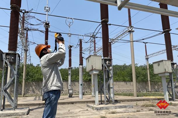 图为高公司检修人员用红外测温仪对升压站进行测温