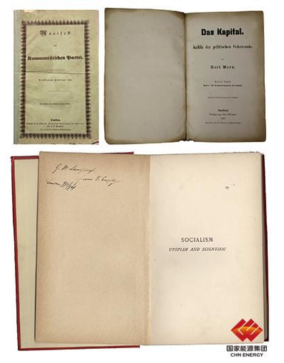 左上图为1848年《共产党宣言》德文第一版。右上图为1867年《资本论》德文第1卷第一版。下图为恩格斯的题字赠书《社会主义从空想到科学的发展》,1892年英文版。