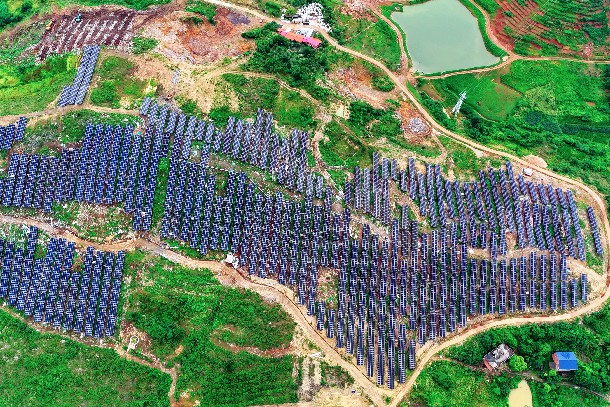 曾经荒芜的山坡上,如今披上了深蓝色的“铠甲”。一排排光伏板整齐划一地矗立着,在夕阳的映照下熠熠生辉,宛如一片波光粼粼的蓝色海洋。光伏板下,绿意盎然的农作物在微风中轻轻摇曳,与头顶的“蓝色海洋”相映成趣,构成了一幅美丽的田园画卷。这是科技与自然的完美融合,是人类追求可持续发展道路上的又一里程碑。
