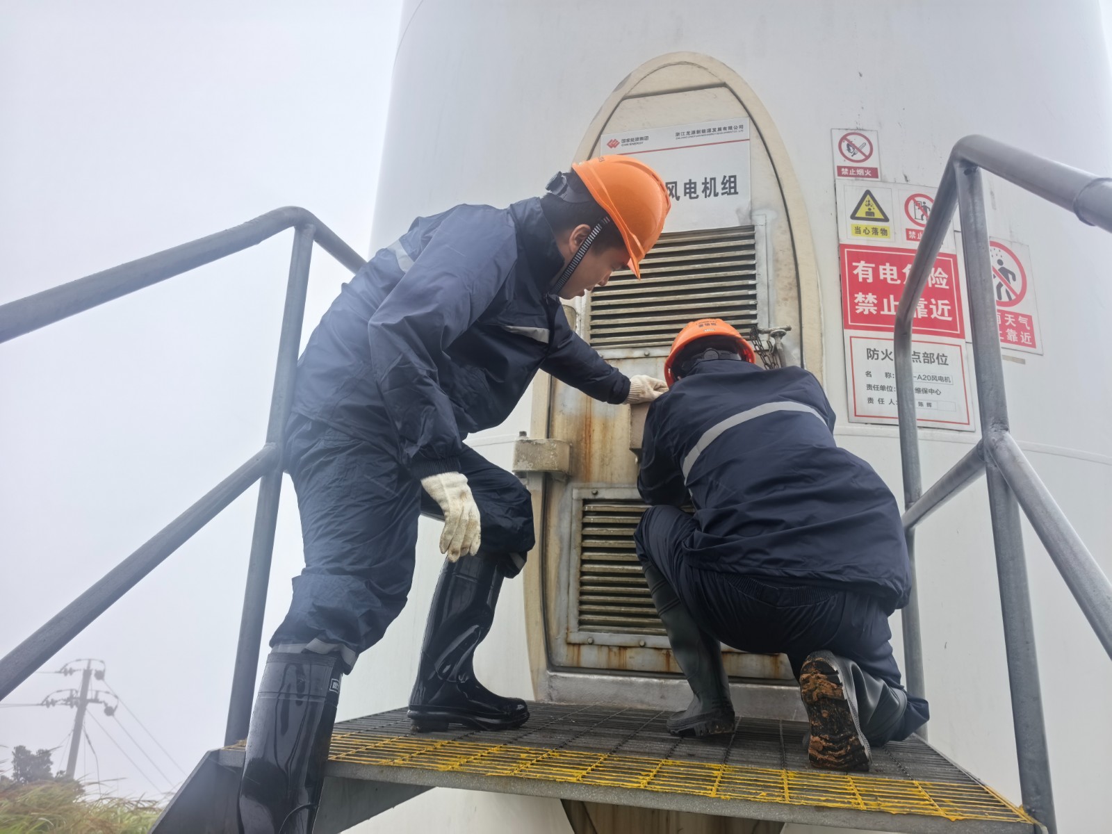 图为设备维保中心人员检查风机塔筒门