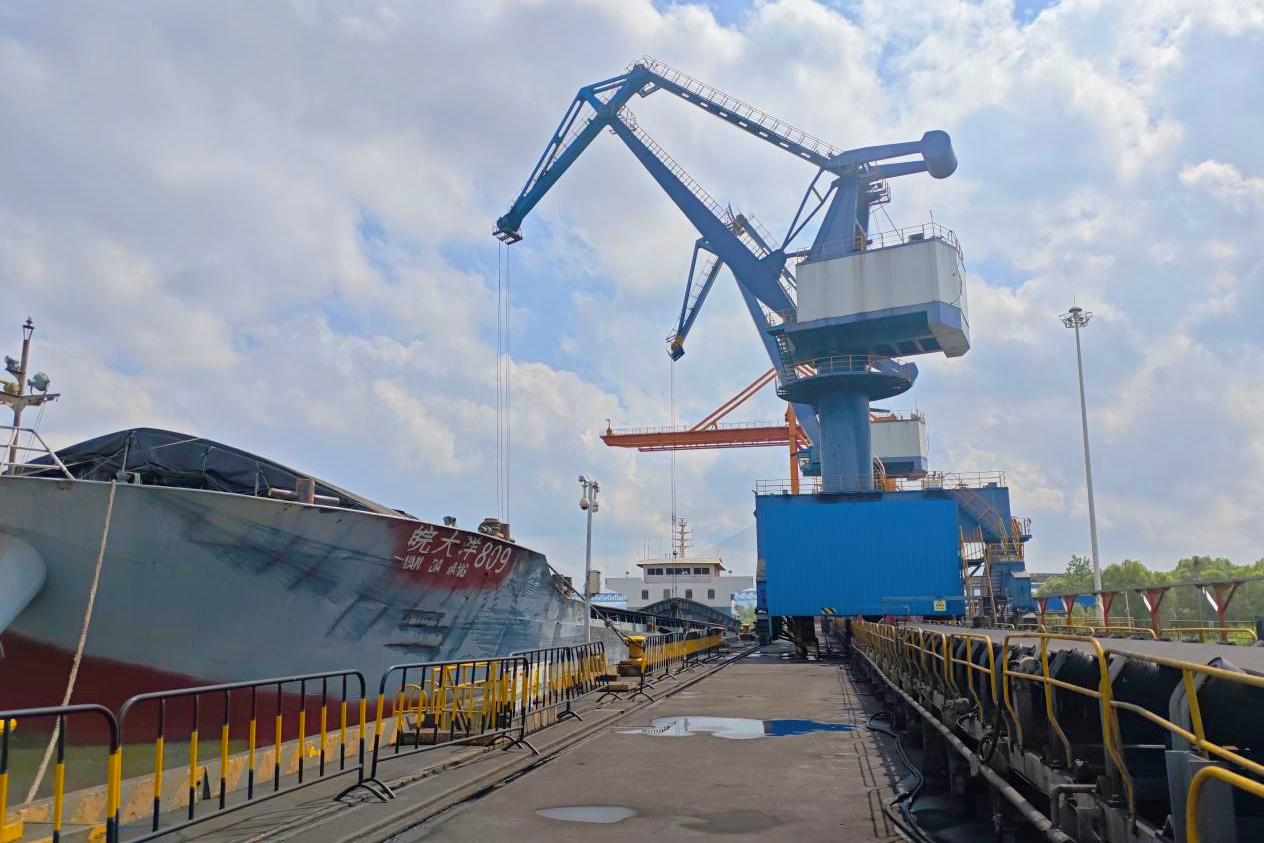 图为铜陵电厂码头卸船机正在抢卸煤炭