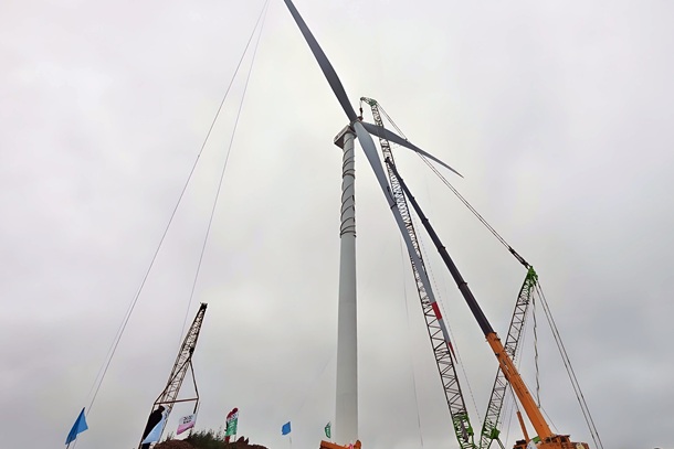 “风速确认3米每秒,符合吊装条件,开始试吊!”地面总指挥任建朋的声音铿锵有力。指令下达,现场气氛骤然凝固。随着叶轮与支架连接的螺栓逐一拆除,硕大的叶轮稳稳悬停在空中。