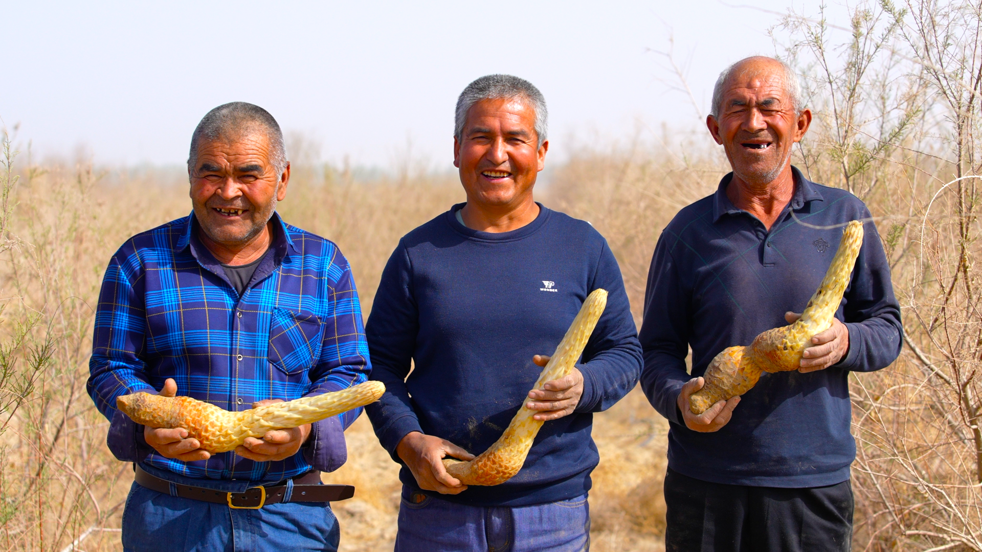 更令人欣喜的是,在这片渐成气候的生态林下,还孕育着另一种金色的希望——“大芸”(肉苁蓉)。这种寄生在红柳、梭梭根部的珍贵药材,如同沙漠里的宝藏,不仅改良着贫瘠的沙地,更成为村民口中的“沙漠黄金”,亩产收益可达1500元,让治沙与致富同行。在茂密的红柳林下,老队员麦麦提·艾合买提正弯腰种植大芸苗。他脸上洋溢着满足的笑容:“种下红柳,就像给沙漠套上了缰绳。林下再种上大芸,沙子稳住了,乡亲们的钱袋子也鼓了,真的是实实在在的好事啊!”