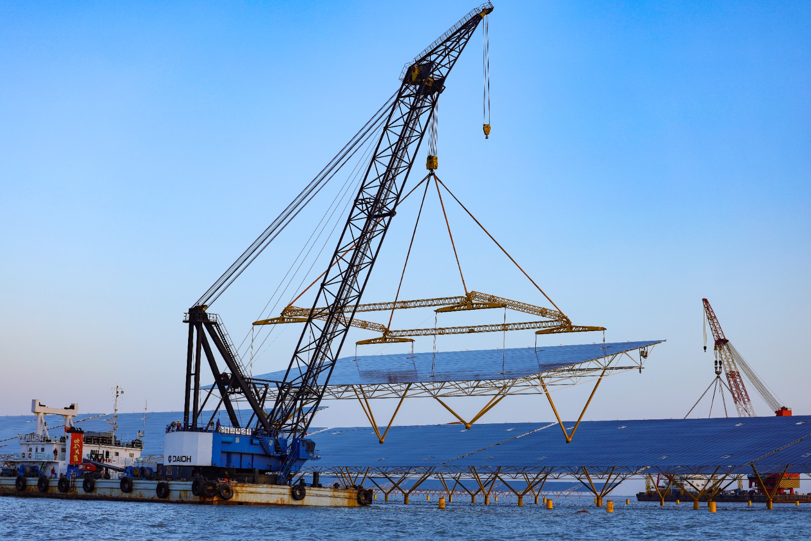 起重船的吊臂缓缓伸展,8根粗如手臂的吊带被精准地绑在光伏平台吊点。“起钩!”随着张波的指令,重达80吨的巨大光伏平台离开甲板,在空中划出优美的弧线。