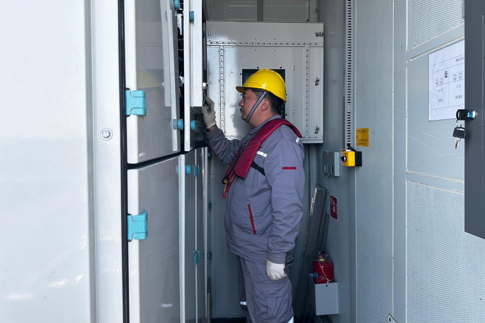 图为工作人员检查箱变保护定值