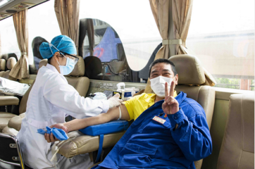 图为志愿者参与无偿献血