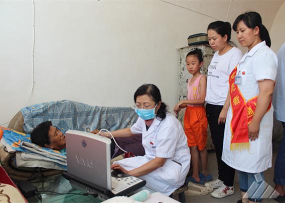 医疗组驱车3小时到达沙峁镇。由于沙峁镇村落分散,行动不便的老年人居多,为了方便村民就诊,此次义诊医疗组分了三个义诊点。在医疗组到达第一个义诊地点时,已经有10多名贫困村民在等候就诊。专家们在简陋的屋子里安装好B超机、心电图机等设备,为前来就诊的村民进行检查。内科、外科、骨科、五官科专家针对村民不同的身体问题进行了细致的检查,并为村民免费发放了常用药品。党员青年志愿者在发放药品时又为他们做了耐心的健康饮食和用药指导。三个多小时里,共有30多名村民接受了健康服务。
