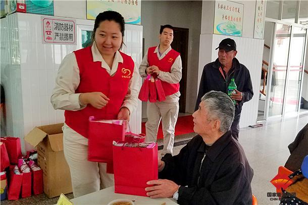 图为该厂志愿者正在为老人发放慰问品。