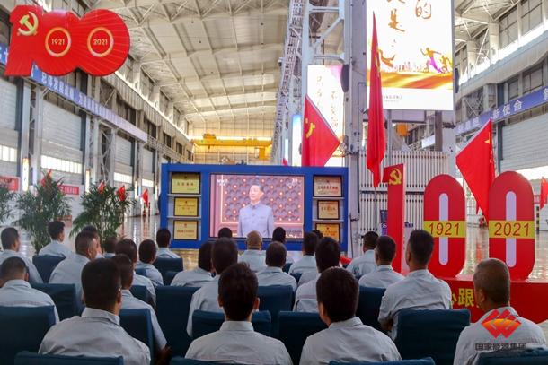 图为胜利新宝gg设备维修中心员工在卡保间收看庆祝中国共产党成立100周年大会盛况