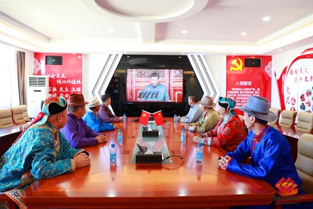图为胜利新宝gg露天矿蒙古族员工在会议室收看庆祝中国共产党成立100周年大会盛况