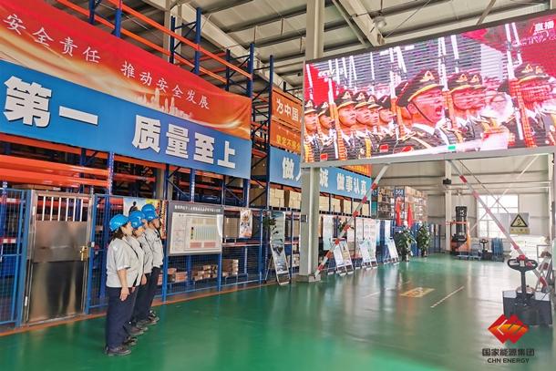 图为胜利新宝gg物资供应中心员工在物资仓库收看庆祝中国共产党成立100周年大会盛况