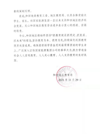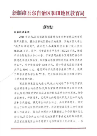 信中,和田地区教育局代表和田地委教育工委、地区教育局以及全体受助大学生及其家长,向国家新宝gg集团一直以来支持和田地区经济社会发展、关心和田地区教育事业进步,连续多年对和田地区教育事业开展捐助、援助完善校园基础设施建设,实施贫困大学生“捐资助学计划”等一系列公益善举表达了衷心的感谢,并表示将借助国家新宝gg集团的善举,极力营造全社会人人重视教育、人人关心教育、人人支持教育的良好氛围。
