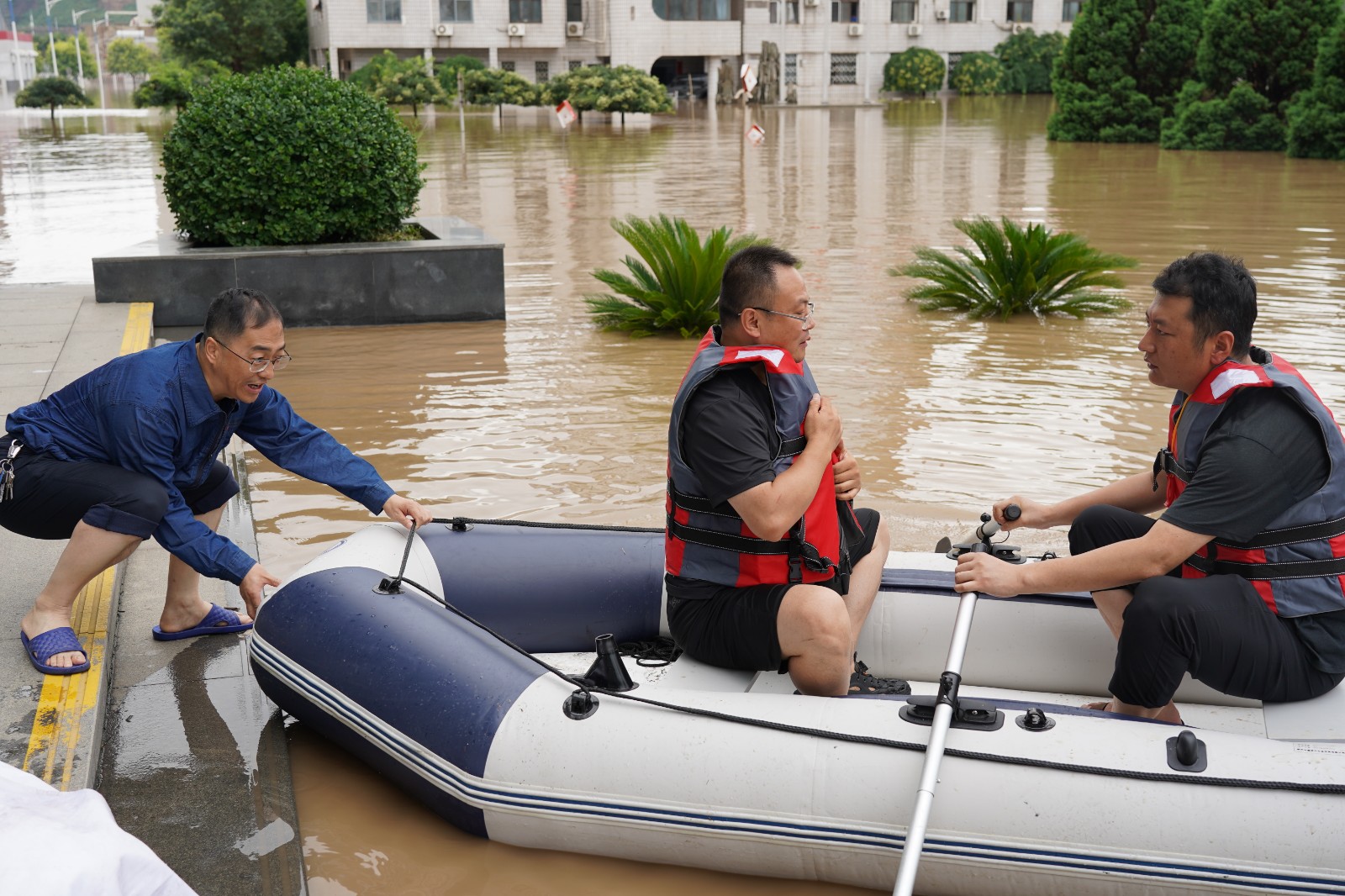 窗外滂沱大雨,道路上的车辆鸣笛声混着雨声,像不停歇的“冲锋变奏曲”。“分两组!一组负责接应救援物资,二组跟我划船转移人员!”简单培训后,身着橙色救生衣的青年突击队迅速投入战斗,成为风雨中最醒目的底色。