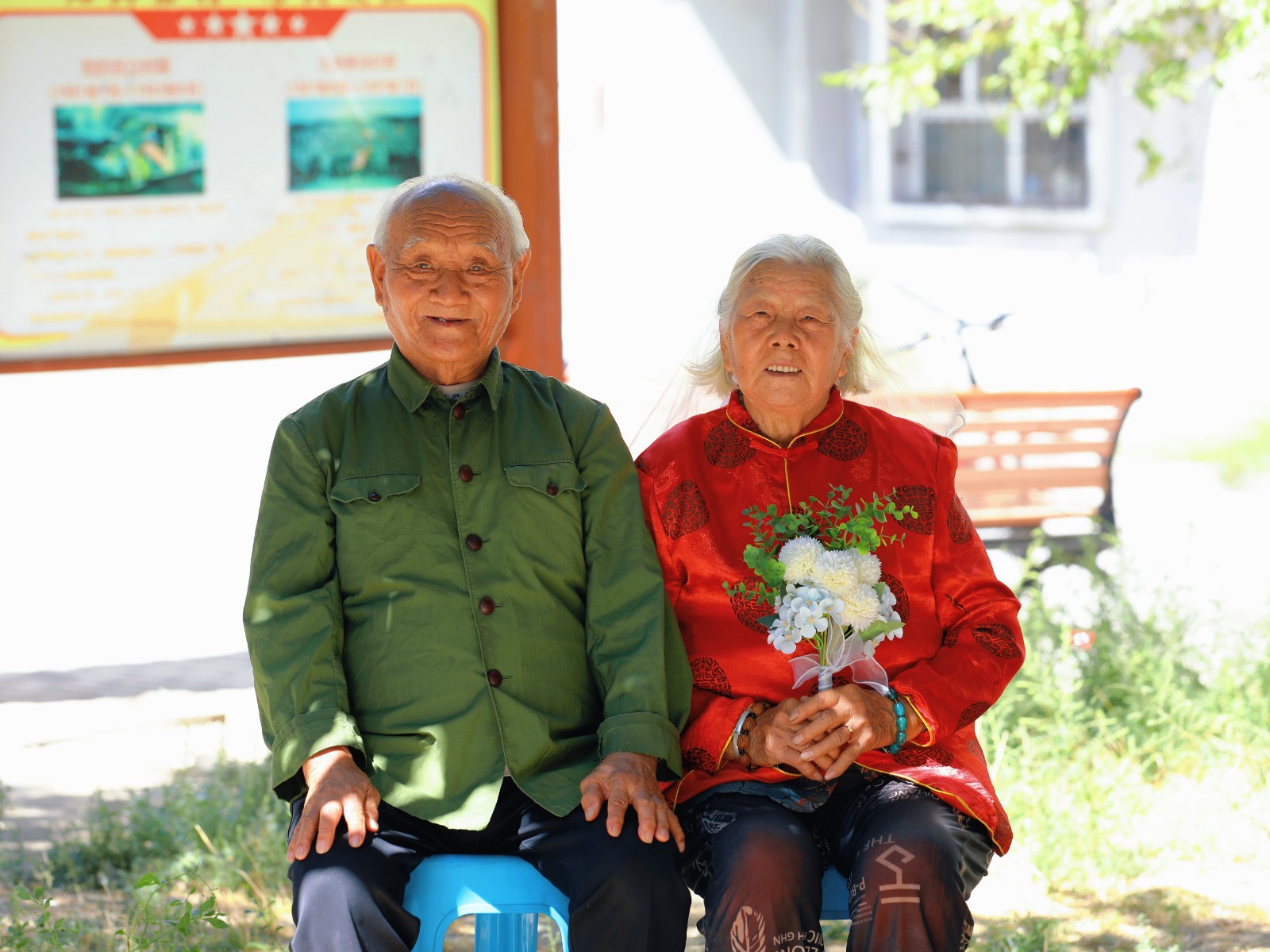 图为退休职工于雄华与爱人尤秀兰老人脸上洋溢着灿烂的笑容