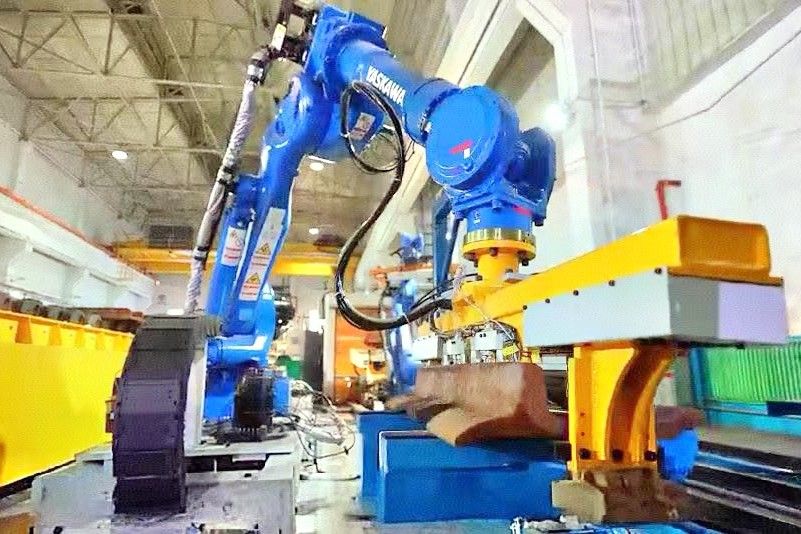 图为矿用大型工程设备履带板柔性机器人正在抓取履带板