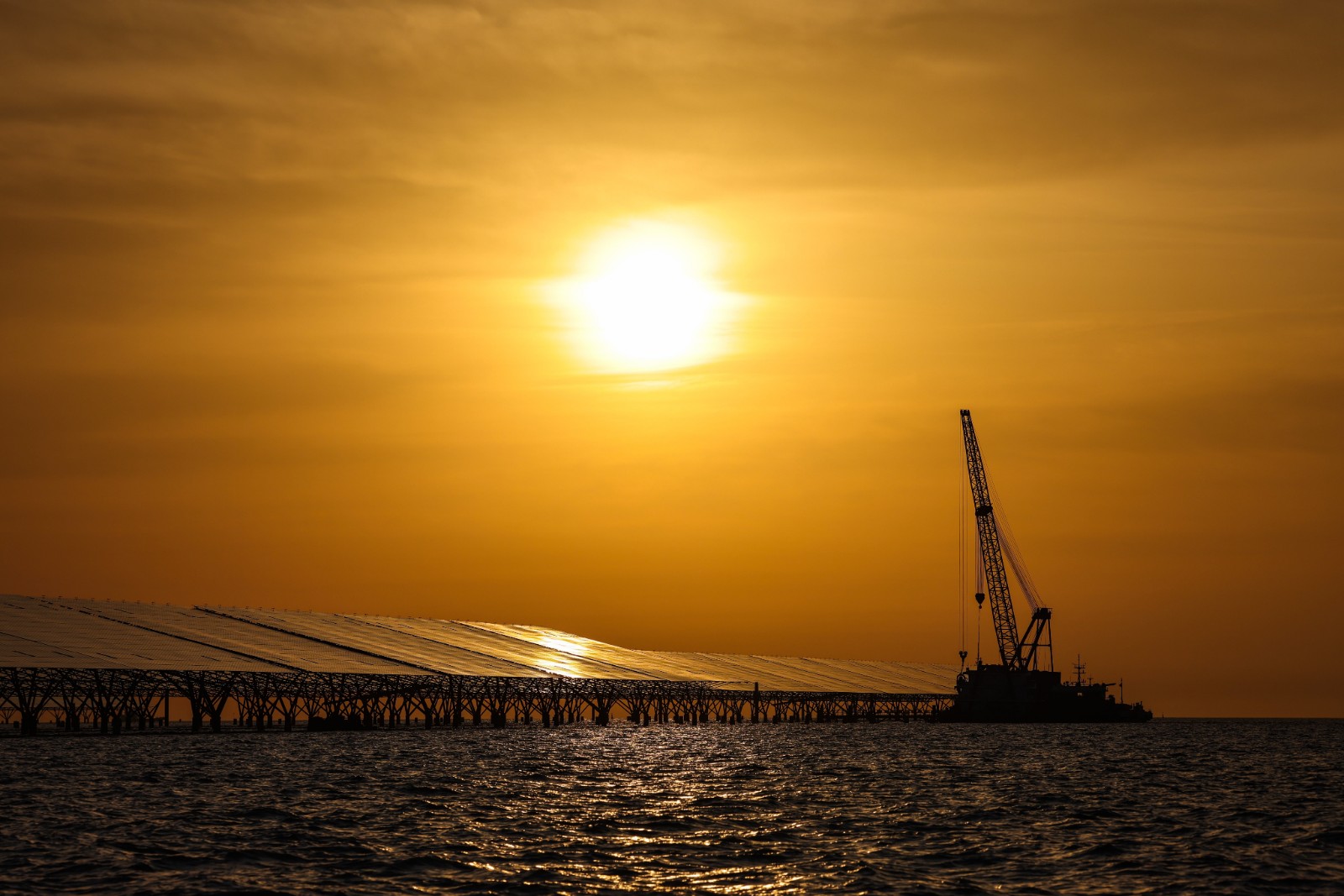 夜幕降临,一轮明月从海平线上升起。HG14项目的光伏板在月光下泛着幽蓝的光芒,如同镶嵌在大海上的巨大宝石。